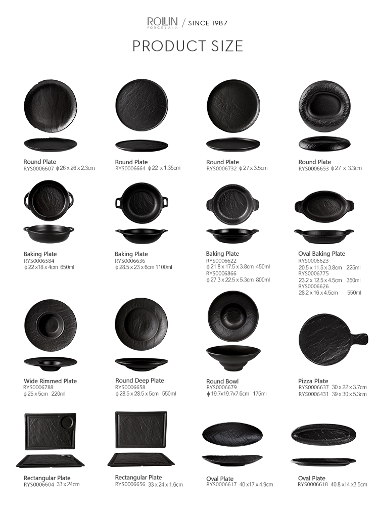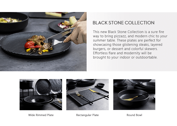 この新しいブラック ストーン コレクションは、夏のテーブルに華やかさとモダンシックをもたらす確実な方法です。これらのプレートは、輝くステーキ、層になったハンバーガー、デザートやカラフルな串を見せるのに最適です。屋内または屋外のテーブルに、さりげないフレアとモダンさをもたらします。