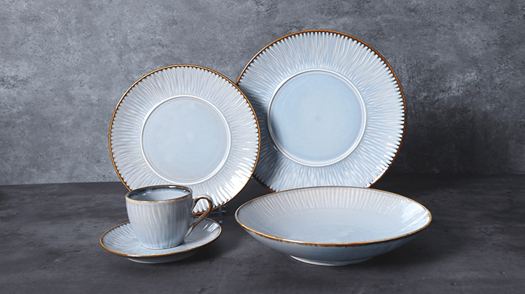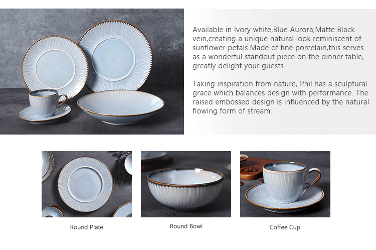 アイボリーホワイト、ブルーオーロラ、マットブラックの静脈があり、ひまわりの花びらを思わせるユニークな自然な外観を作り出します。上質な磁器で作られており、ディナーテーブルで素晴らしい目立つ作品として役立ち、ゲストを大いに喜ばせます。自然からインスピレーションを得たフィルは、デザインとパフォーマンスのバランスをとった彫刻のような優雅さを備えています。隆起したエンボスデザインは、自然の流れの形から影響を受けています。